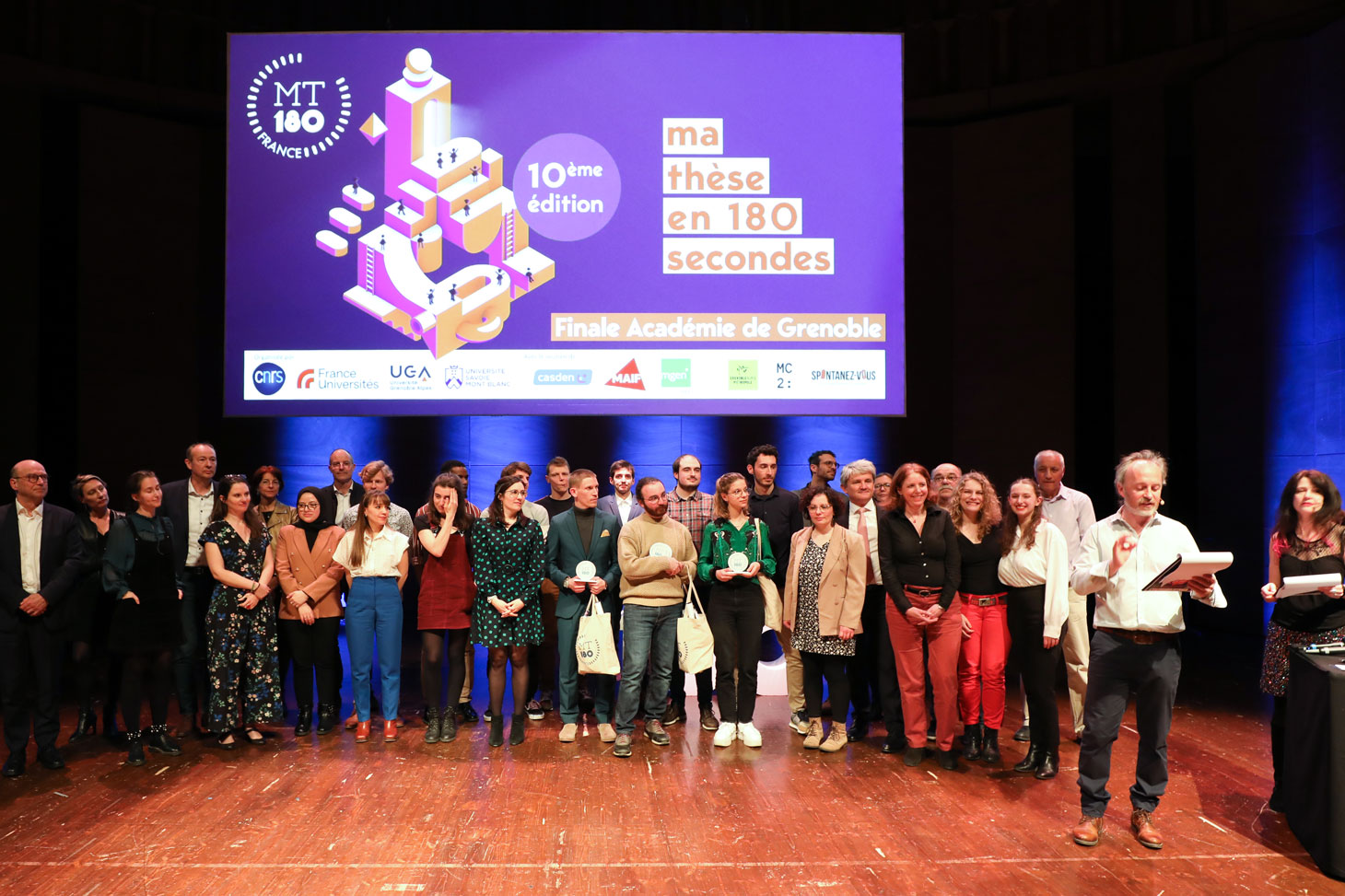 Les doctorantes et doctorants de l’Université Grenoble Alpes et de l’Université Savoie Mont Blanc étaient sur la grande scène de l’Auditorium de la MC2 devant une salle comble à Grenoble ce mardi 21 mars 2023 pour la 10e édition de la finale académique du concours Ma thèse en 180 secondes (MT180). Le public venu très nombreux pour soutenir les 16 finalistes et présent aussi en direct sur le live YouTube avec déjà 1 300 vues au lendemain de la finale.
