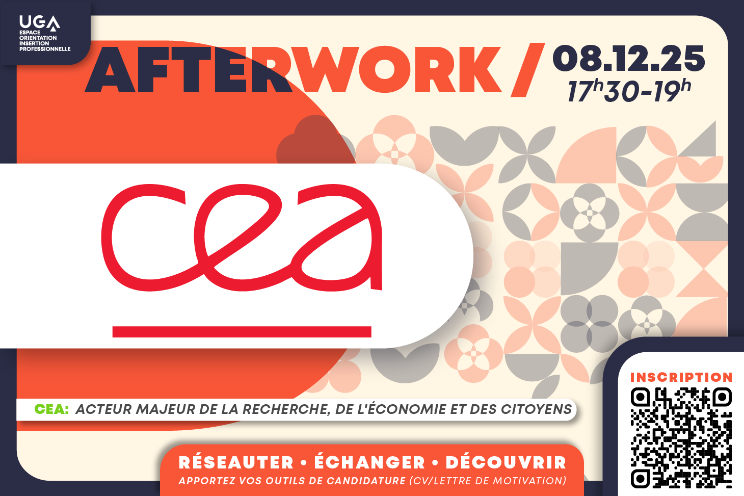 Une fois par mois, l’Espace orientation et insertion professionnelle de l’UGA vous propose de découvrir une entreprise du territoire et de commencer à créer votre réseau professionnel  ! Prochain rendez-vous afterwork, venez rencontrer le CEA.