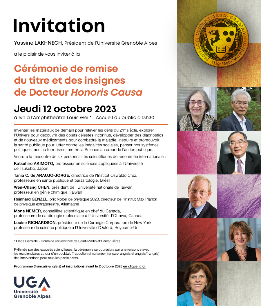 Honoris Causa de l’Université Grenoble Alpes (UGA) pour l’excellence de leurs travaux de recherche, leurs contributions exceptionnelles aux arts, aux lettres, aux sciences et techniques, et pour leurs liens avec l’UGA.