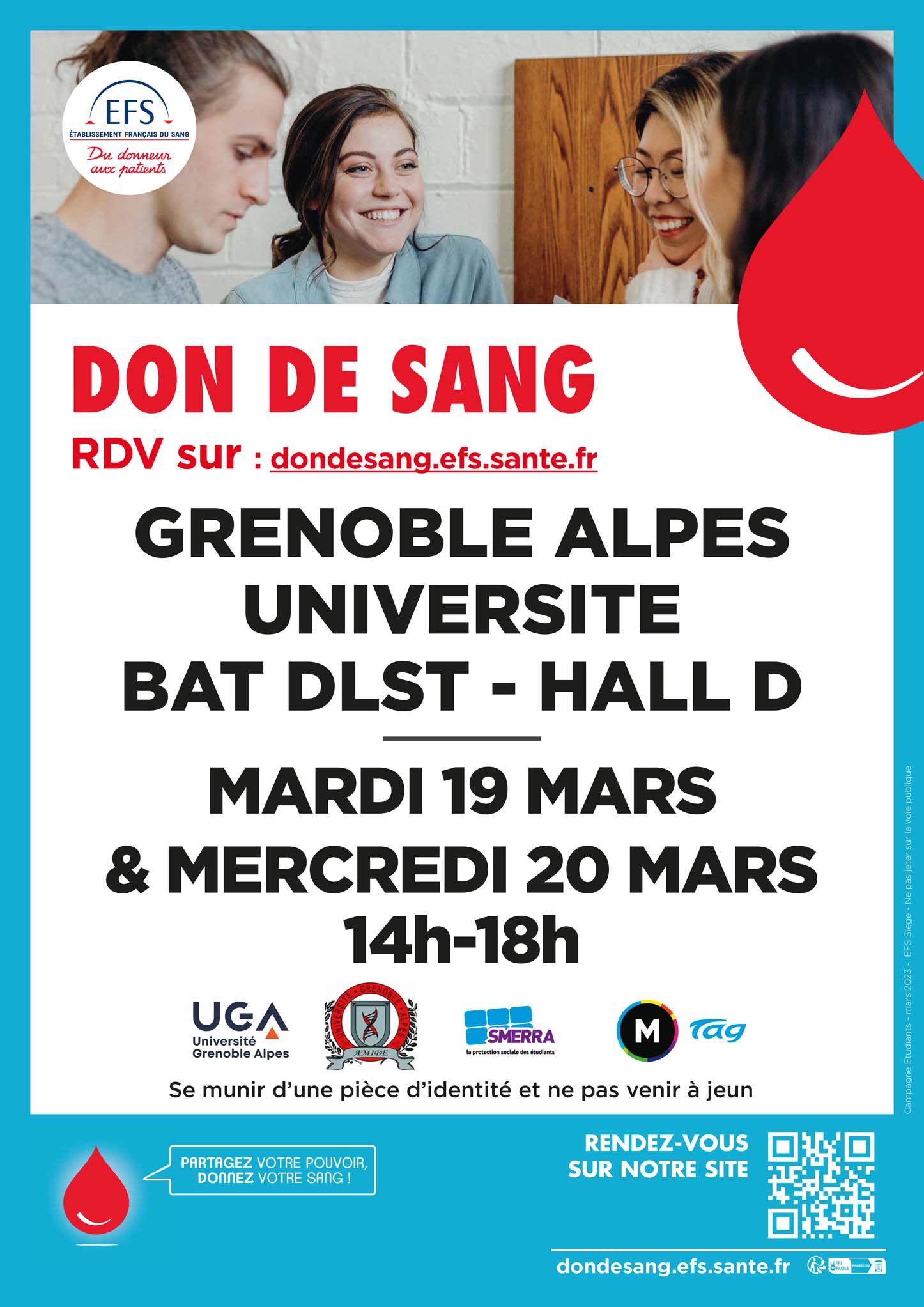 L’Établissement français du sang (EFS) fait ainsi appel à votre générosité et organise deux nouvelles collectes de sang les mardi 19 et  mercredi 20 mars 2024 de 14h à 18h au DLST (plan d'accès) sur le Domaine universitaire. On compte sur vous ! Organisée les 13 et 14 février 2024 à Grenoble IAE sur le campus, la dernière collecte a rassemblé 135 étudiants ou personnels (sur les 120 prévus) dont 50 nouveaux donneurs et a permis de prélever 115 poches pour les malades. Merci !