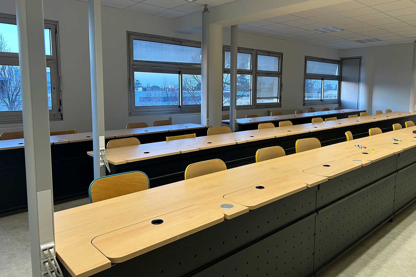 Les tables comportent de plus un déport sur table des principales interfaces des ordinateurs (port USB ou casque) et d’une alimentation électrique disponible pour brancher les appareils portables personnels des étudiants.