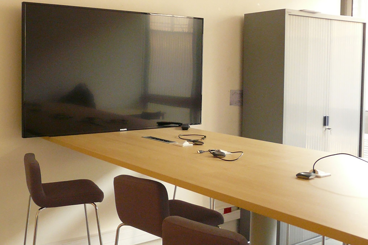 La salle "clickshare" située au dernier étage du bâtiment ARSH est un espace de travail de 15m² pouvant accueillir jusqu'à 6 personnes. Cet espace permet aux étudiants de travailler en mode projet par petits groupes. Également ouverte à un public d’enseignants, d'enseignants chercheurs ou personnel de l’UFR, cette salle est particulièrement adaptée au travail collaboratif (co-rédaction de publications par exemple) ou aux réunions en petits groupes.